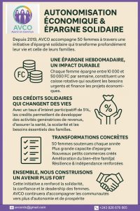 Depuis 2019, l’Association Féminine AVENIR EN COMMUN (AVCO) met en œuvre une initiative communautaire d’associations villageoises d’épargne et de crédit (AVEC), visant à renforcer l’autonomie économique des femmes et leur capacité à faire face aux vulnérabilités sociales et économiques.